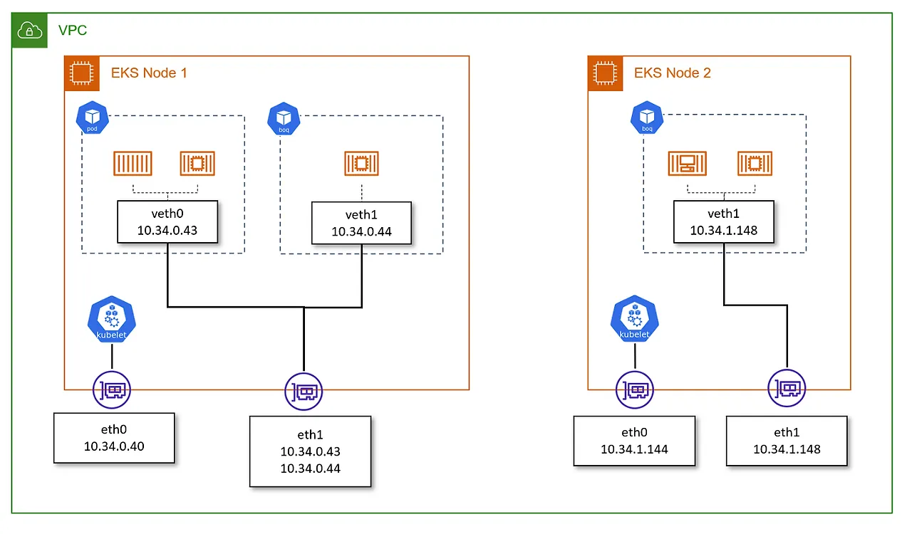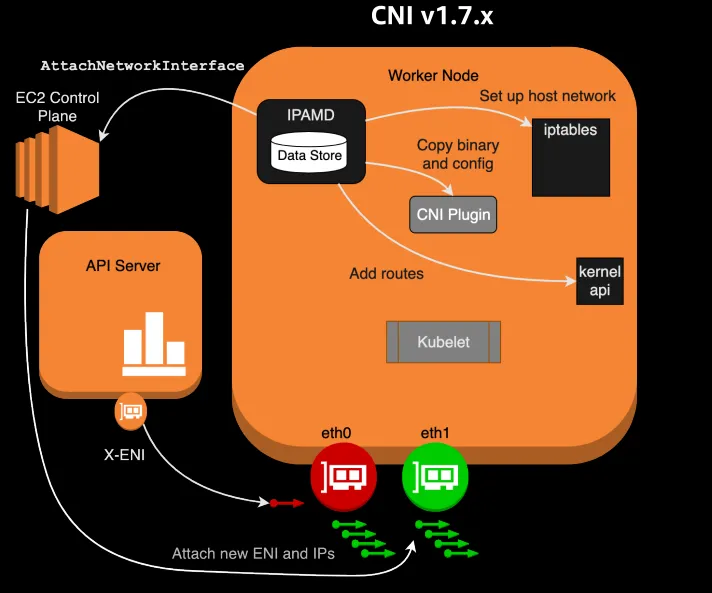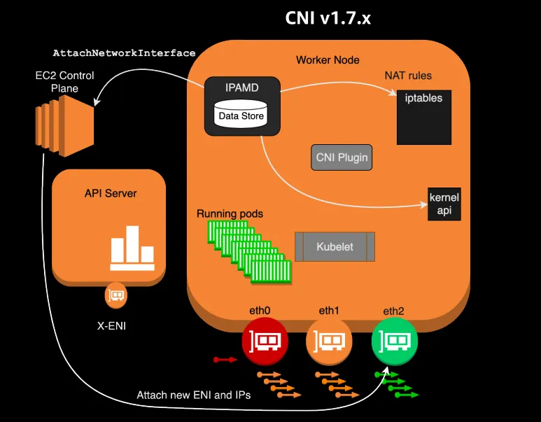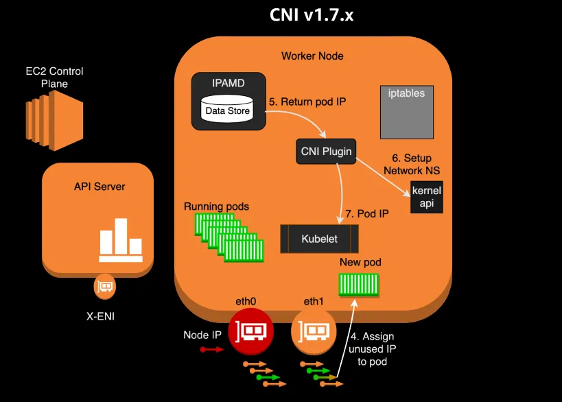 - 새로운 Pod가 생성 및 할당될 때: ENI의 secondary IP 중 하나가 Pod에 할당된다. hostNetwork: true가 설정된 경우 노드와 동일한 IP를 가질 수도 있다.